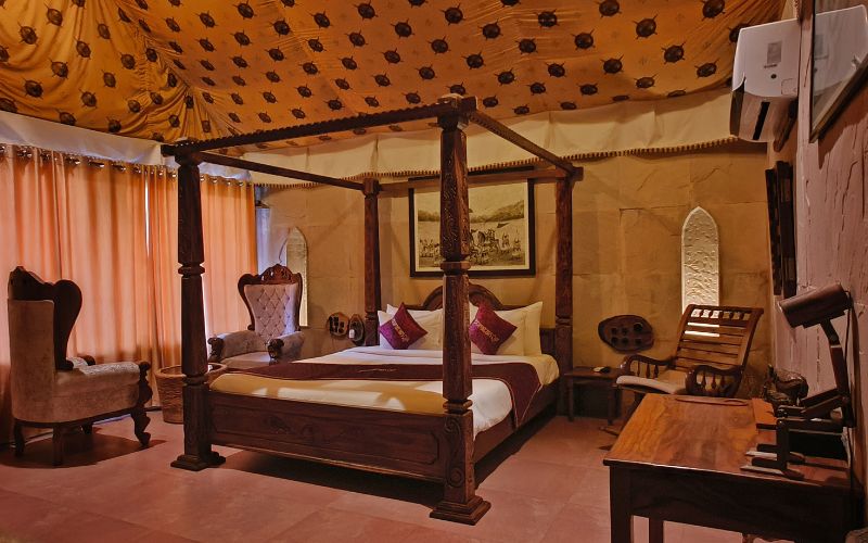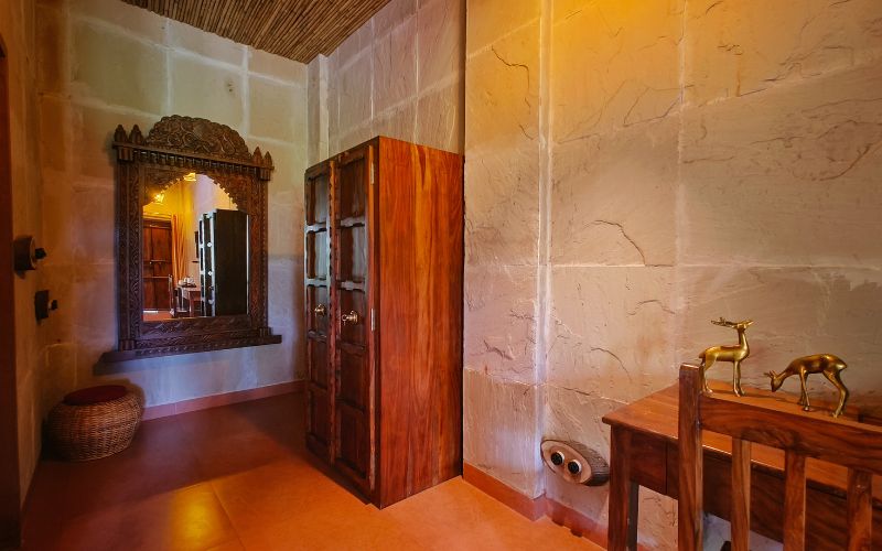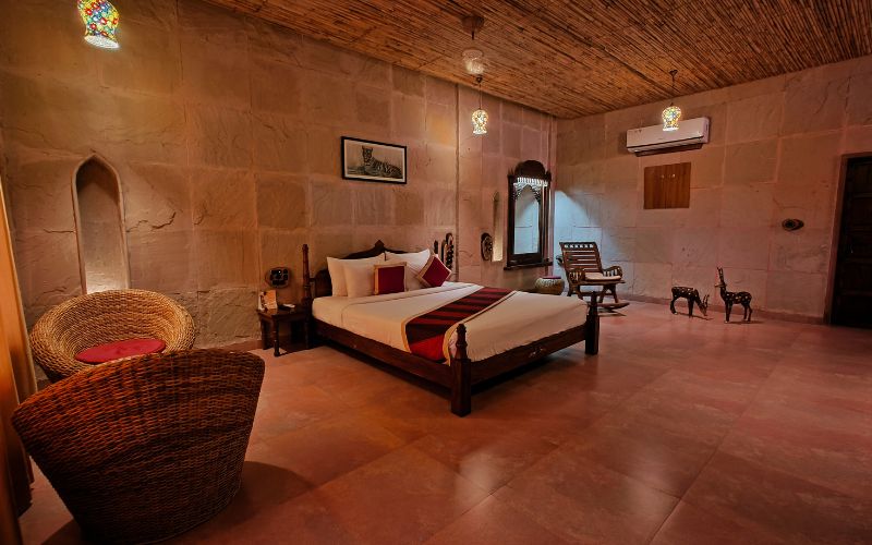 Puratan Qila in Ranthambore stands as a majestic retreat, blending the grandeur of a historic fort with modern luxury. Guests are greeted by an imposing carved main door, echoing the gates of a royal palace, which opens into a world of elegance. A wide, sweeping staircase leads to the heart of the resort, offering a cinematic sense of arrival and setting the tone for an unforgettable stay.