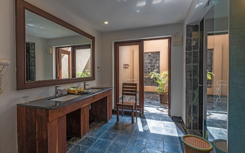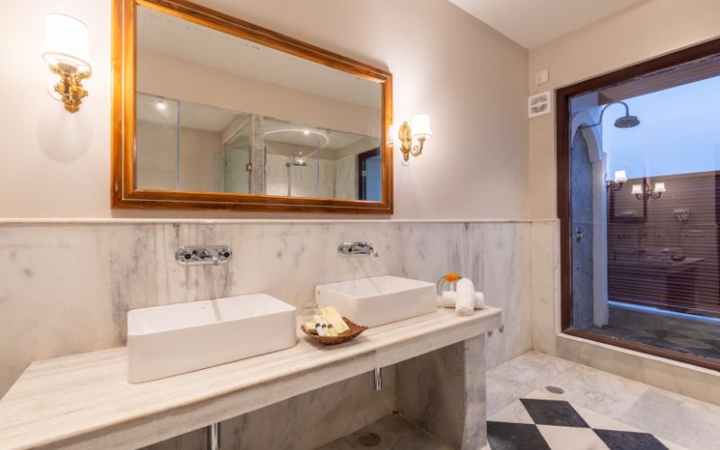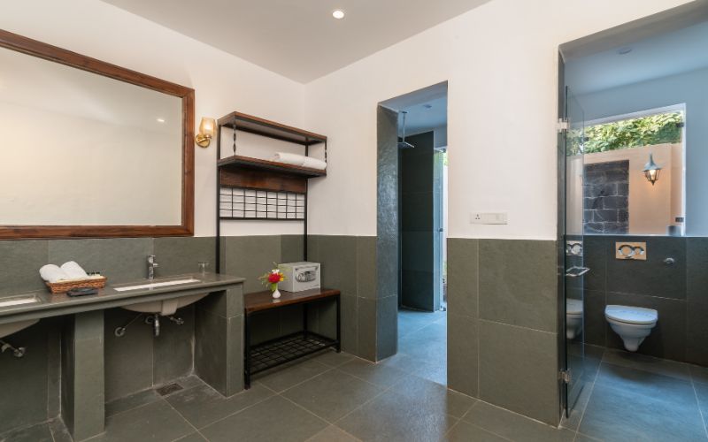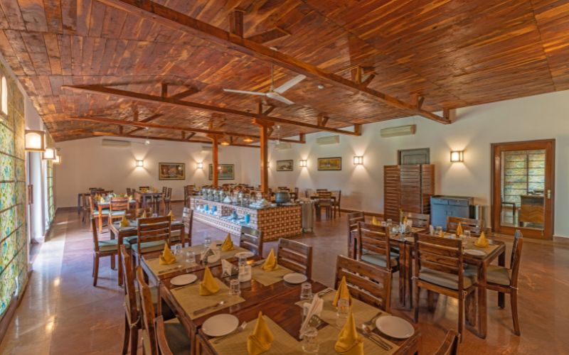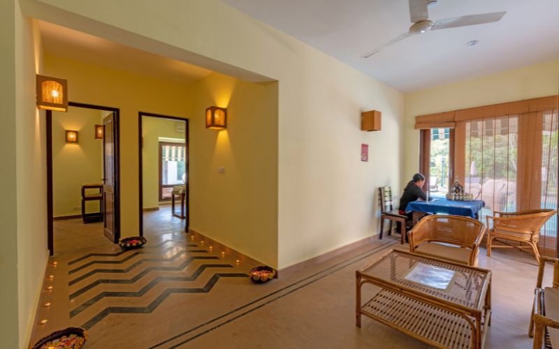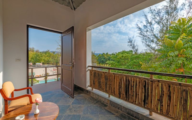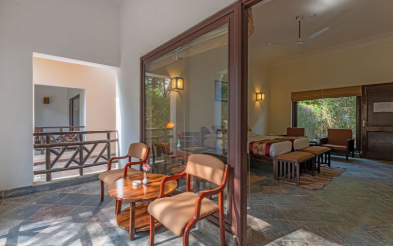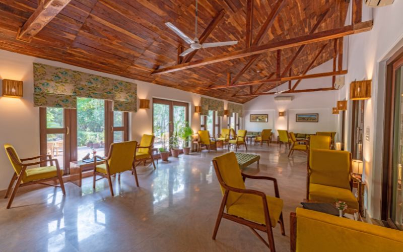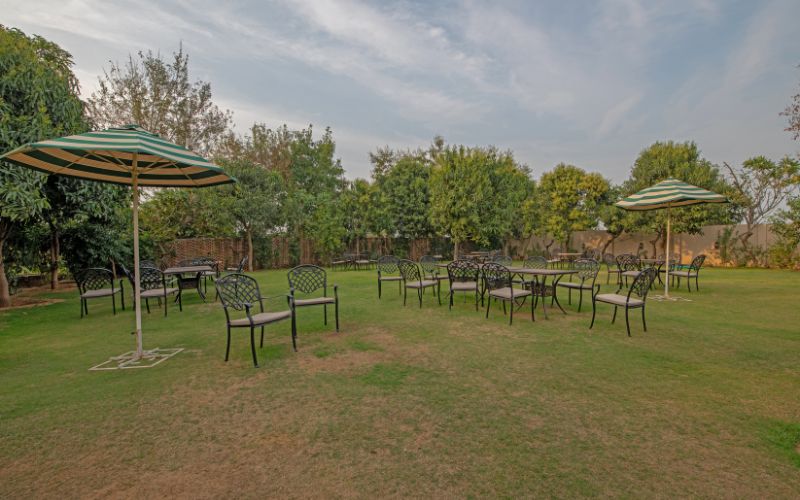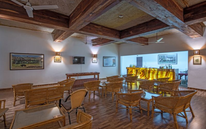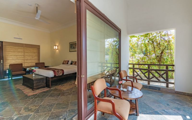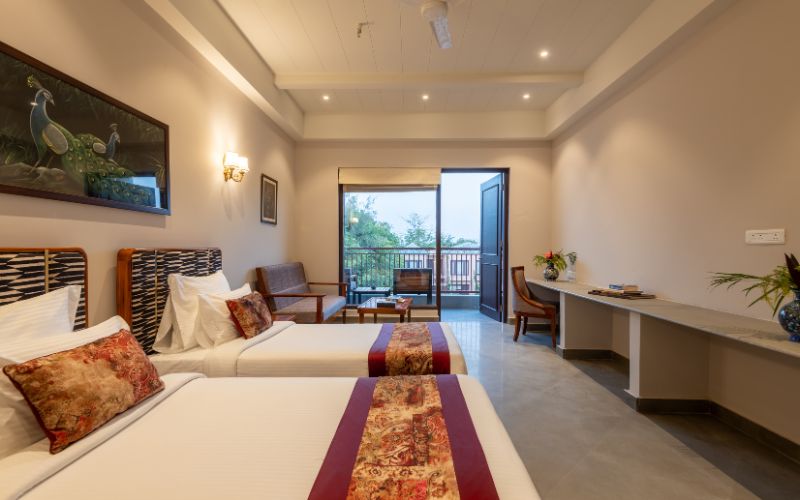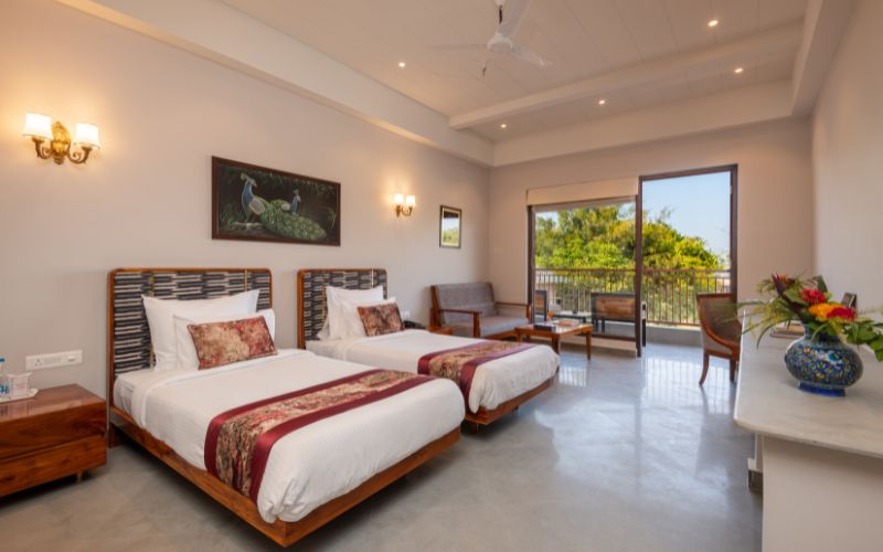 The resort features spacious rooms designed for relaxation, with modern amenities that complement its heritage style. Many rooms include open-air showers, allowing guests to refresh amidst nature while enjoying privacy and serenity. With a large swimming pool, outdoor dining areas, and well-maintained gardens, Ranthambore Kothi Resort provides a luxurious and tranquil base for exploring the wildlife and cultural richness of Ranthambore, making every stay memorable and rejuvenating.