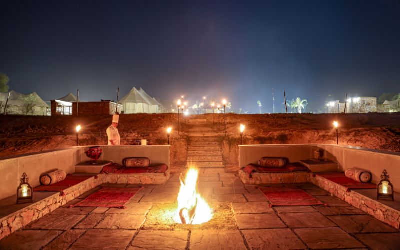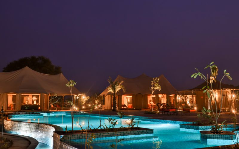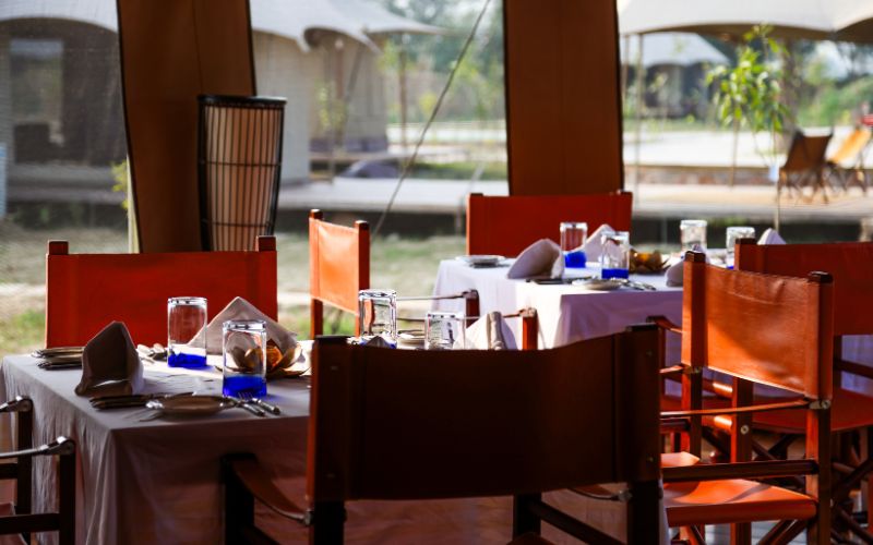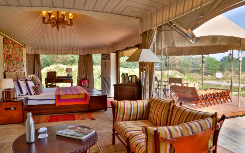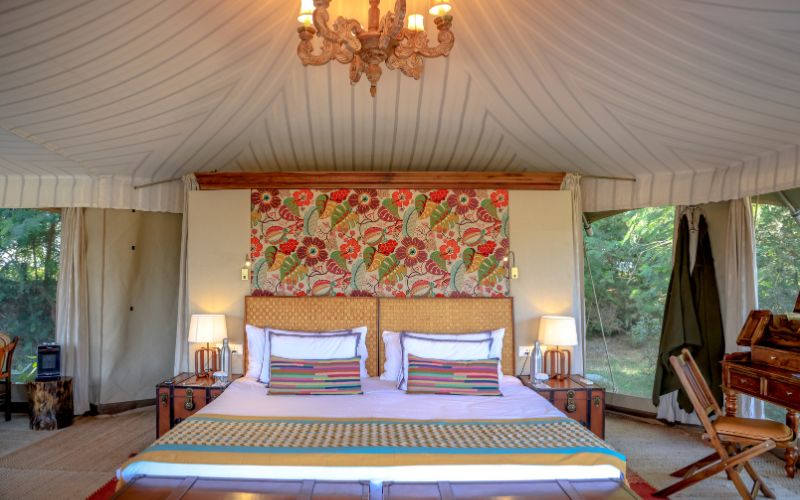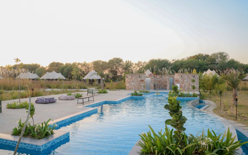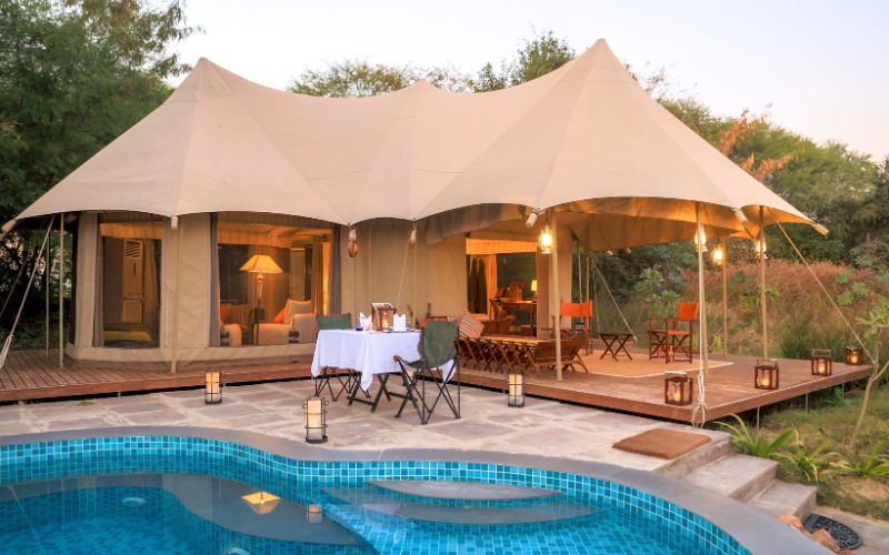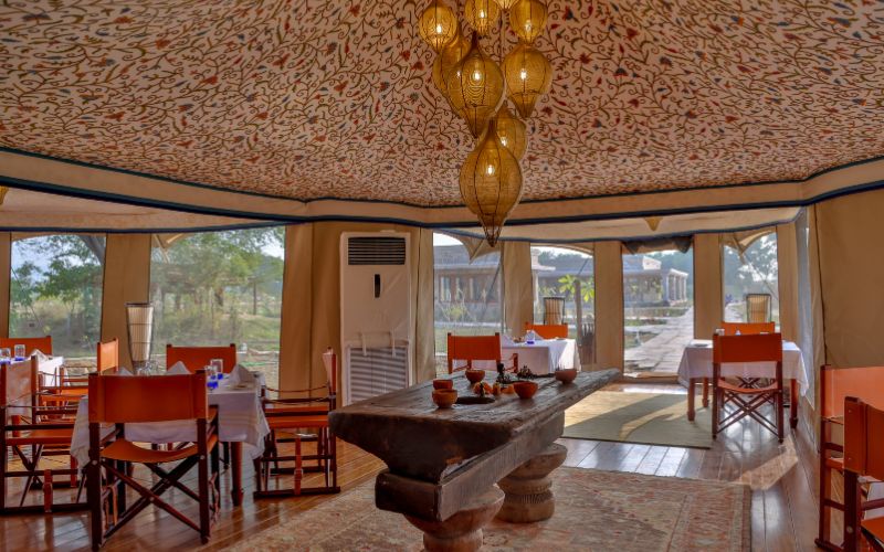 Inspired by classic African safaris and Rajasthan’s royal legacy, Sawai Shivir features thoughtfully designed luxury tents that combine understated elegance with modern amenities. Each tent is spacious, climate-controlled and equipped with an ensuite bathroom and private sit-out, ensuring privacy and relaxation amidst the wilderness. The Presidential Suite elevates the experience further with a private plunge pool and expansive living space, ideal for guests seeking exclusivity.